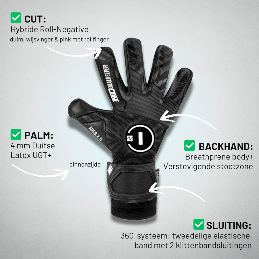 Latex vormt de kern van onze prestaties en met de Ares 2.0 UGT+ II hebben we een nieuw niveau bereikt. Met een handpalm van 4 mm van 100% natuurlijke Duitse UGT+ II-latex hebben we de formule geperfectioneerd om ongeëvenaarde grip en uitzonderlijke duurzaamheid te bieden. Deze hoogwaardige latex is ontworpen voor elk speeloppervlak en elke weersomstandigheid en zorgt voor superieure controle in zowel droge als natte omstandigheden zonder afbreuk te doen aan de duurzaamheid die wordt geëist door elite spel.